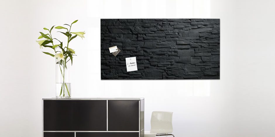 Las pizarras de vidrio imantado artverum, con sus diferentes acabados en colores negro, blanco, rojo, o en texturas hormigón y pizarra natural, llaman la atención del que las contempla.